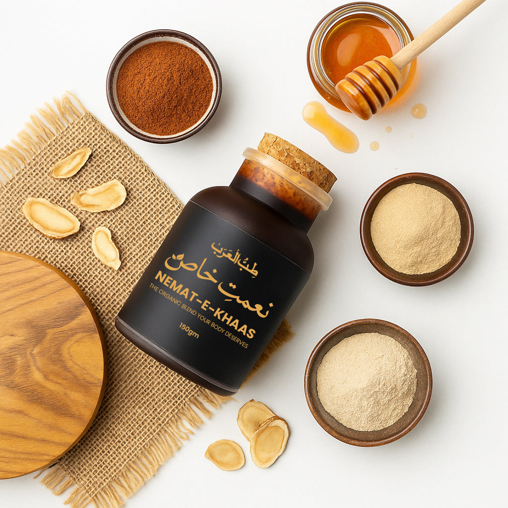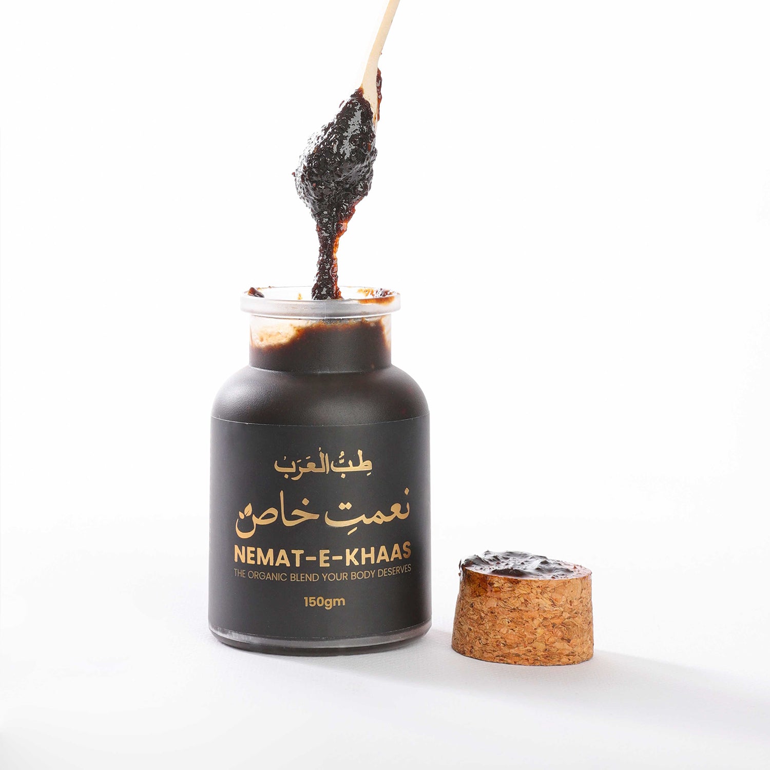 NEMAT-E-KHAS is a powerful blend of natural herbs. Made with care, it offers a safe, chemical-free way to support your body and elevate your well-being.